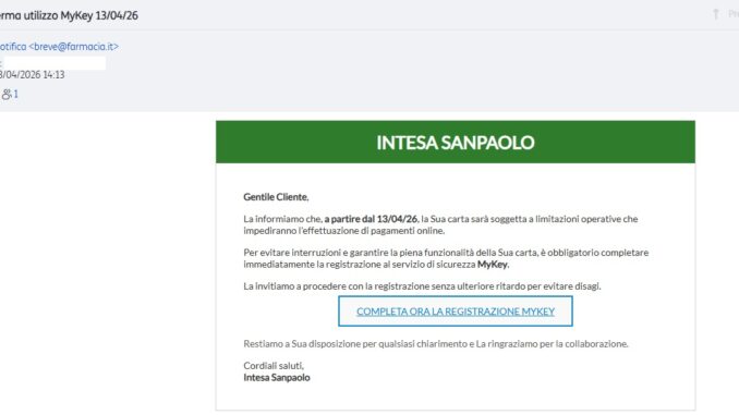 Evidenzio una campagna di phishing a tema Intesa Sanpaolo in lingua italiana basata su un falso messaggio di “Conferma utilizzo MyKey”.